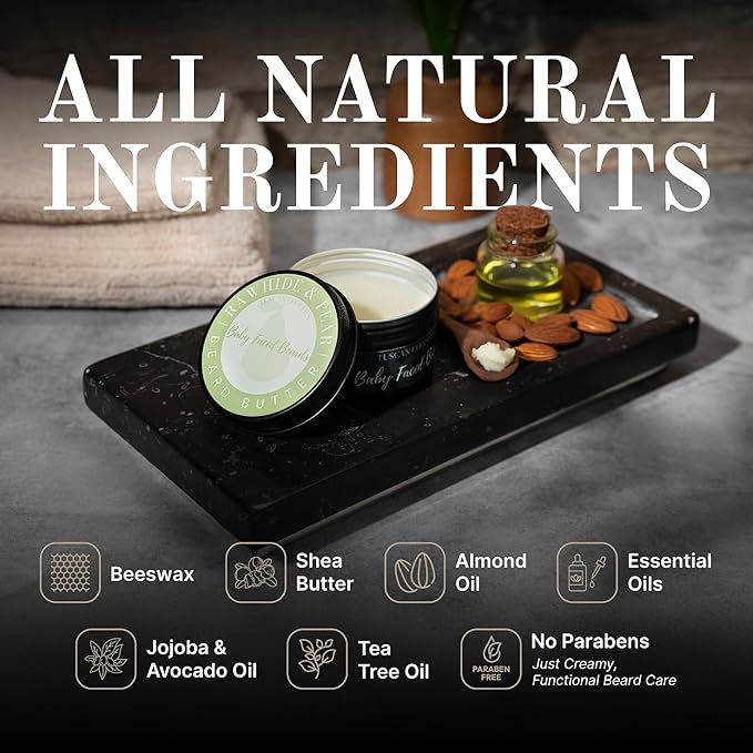 - BABY FACED SOFTNESS: All-natural beeswax, shea butter, almond oil, jojoba, avocado, and tea tree oils deeply condition and soothe skin, soften coarse hairs, and help your beard hold its shape.