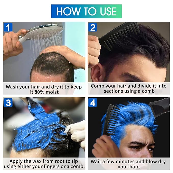 - Explore Fashionable Hair Color Wax Shades : Unleash your creativity with vibrant temporary hair colors—Green, Orange, Claret, Purple, Red, and Blue.Simply choose a shade and apply for a bold look that washes out easily