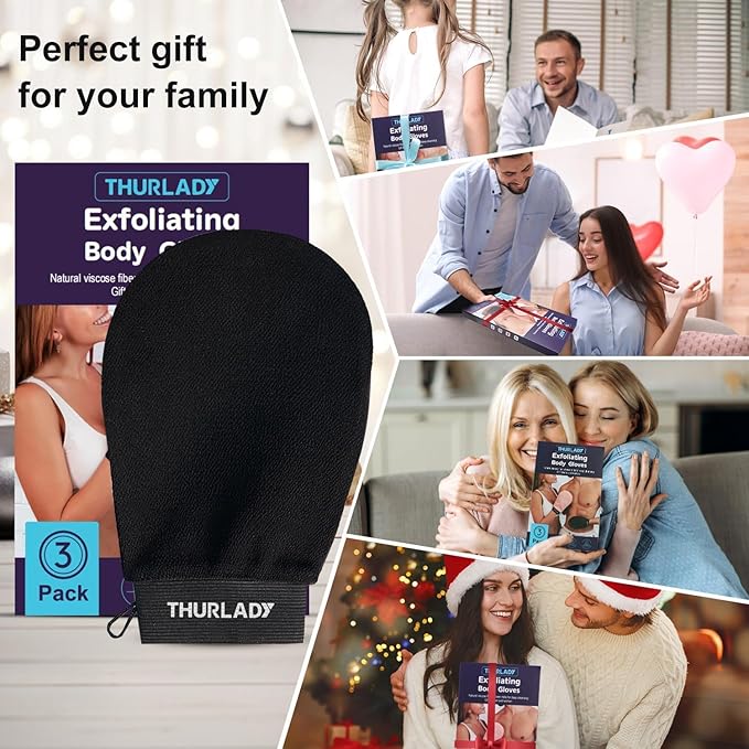 - Effortless Exfoliation, Expert-level Routine Care: THURLADY Exfoliating Gloves are an essential addition to your bath routine. The 3-pack set can be used by the whole family. Elevate your self-care routine with our exfoliating gloves and enjoy the confidence of silky smooth skin. They also make an ideal holiday gift for family and friends