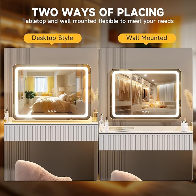 - 👍【Smart Touch Control & Memory Function】This makeup mirror with lights has 3 smart touch buttons, turn on/off the light by touching the sensor switch, Press left button to change the color modes, long press right button to adjust the led brightness. This lighted makeup mirror is specially designed memory functionfunction keep your lights setting like your last use.
