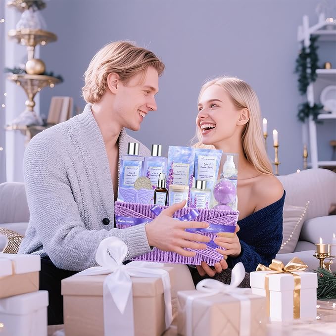 Gift baskets for women, 15Pcs Lilac Women Bath Gift Baskets w/Body Mist, Diffuser, Bath Bomb. Unique Relaxing Spa Gift Basket Set, Mothers Day Gifts for Mom Wife Grandma Daughter Friends Sister