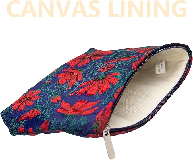 PAZIMIIK Makeup Bag Large Cotton Zipper Pouch for Purse Travel Canvas Make Up Organizer for Women Cosmetic,Brocade Navy Blue