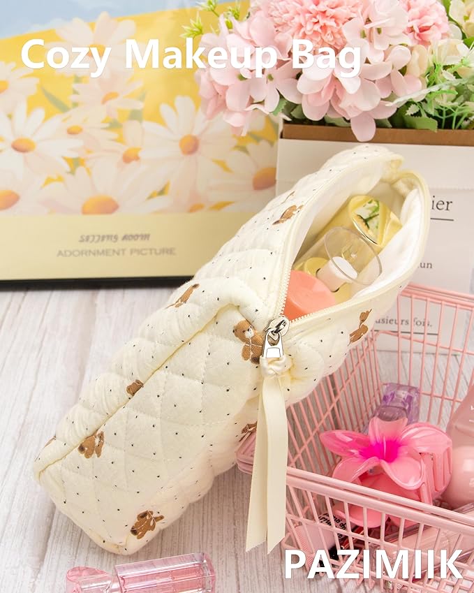 PAZIMIIK 3PCS Makeup Bag SET Large Travel Quilted Zipper Soft Cosmetic Case Pouch for Women Girls Make Up,Gauze Bear