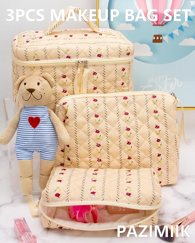 PAZIMIIK 3PCS Makeup Bag SET Large Travel Quilted Zipper Soft Cosmetic Case Pouch for Women Girls Make Up,Little Flower Beige