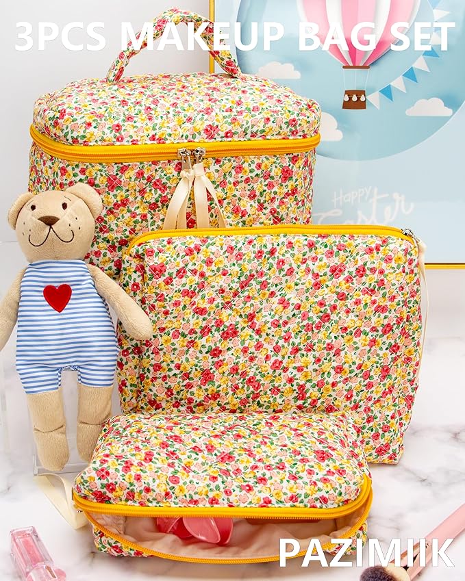 PAZIMIIK 3PCS Makeup Bag SET Large Travel Quilted Zipper Soft Cosmetic Case Pouch for Women Girls Make Up,Little Flower