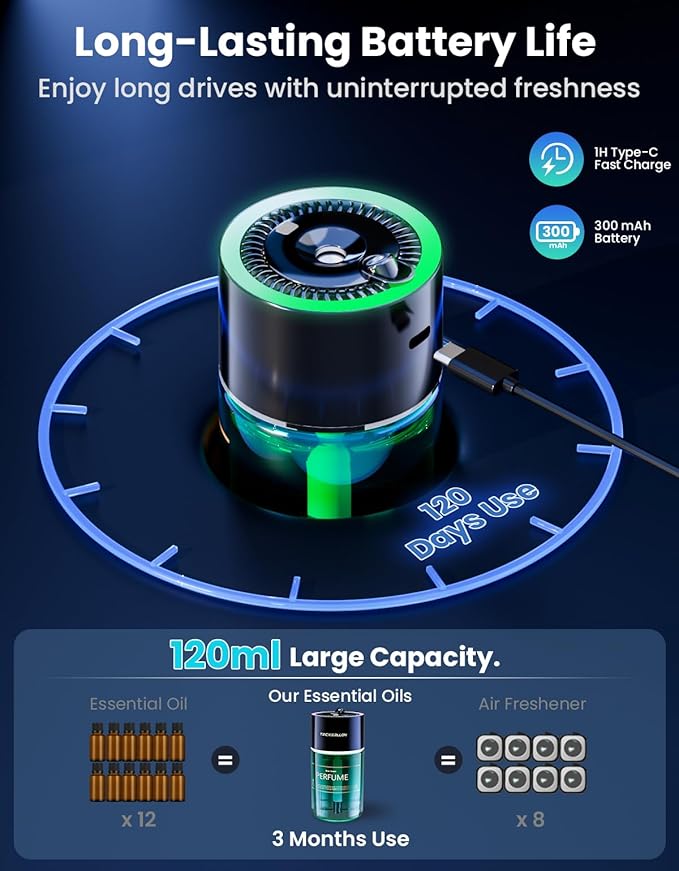 - 【Type-C Fast Charging|Powerful & Convenient】This car scent diffuser comes with a built-in 300mAh rechargeable battery that fully charges in just 1 hour and provides up to 1,600 sprays or 120 days of use per charge.