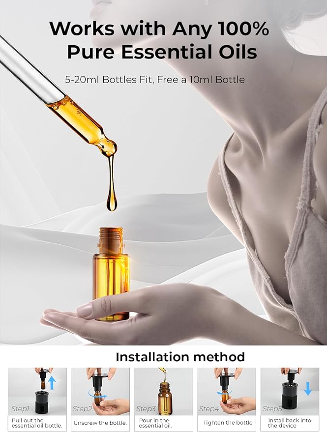 - Universal Bottle Compatibility: The diffuser fits standard 5mL,10mL,15mL and 20mL US essential oil bottles. Just screw your bottle right on nozzle, or pour oil into the included bottle,Enjoy effortless, tool-free installation