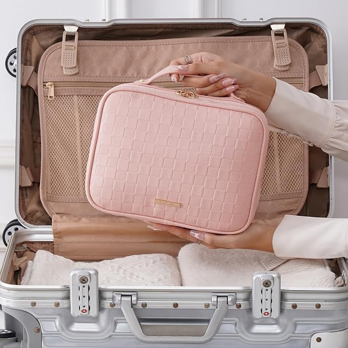 RIGHT AWAY Travel Toiletry Bag for Women, Waterproof Makeup Bag&Case, Portable Cosmetic Organizer Checkered Make up Bag for Full Sized Toiletries,Cosmetics and Travel-Size Accessories,Pink Checkered