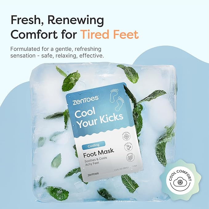ZenToes Cooling Foot Mask - Hydrating Peppermint & Shea Butter Sheet Masks with Menthol for Soothing Tired, Achy, Dry Feet - Spa Treatment at Home, Paraben & Sulfate Free, 3 Pairs