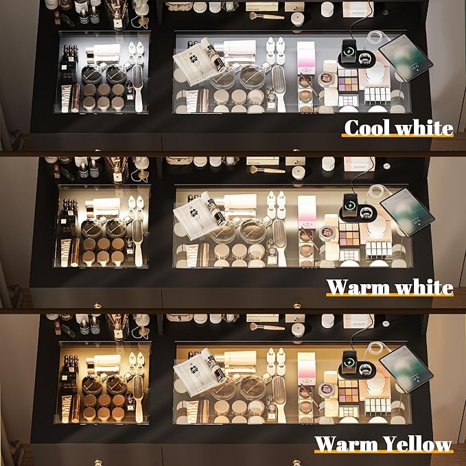 - 【Glass Top Vanity with RGB Drawers】white vanity desk is designed with a transparent tempered glass tabletop, you can easily see everything inside the vanity drawers. The built-in LED lights feature three color temperature modes, adding a touch of brightness and style to any room.