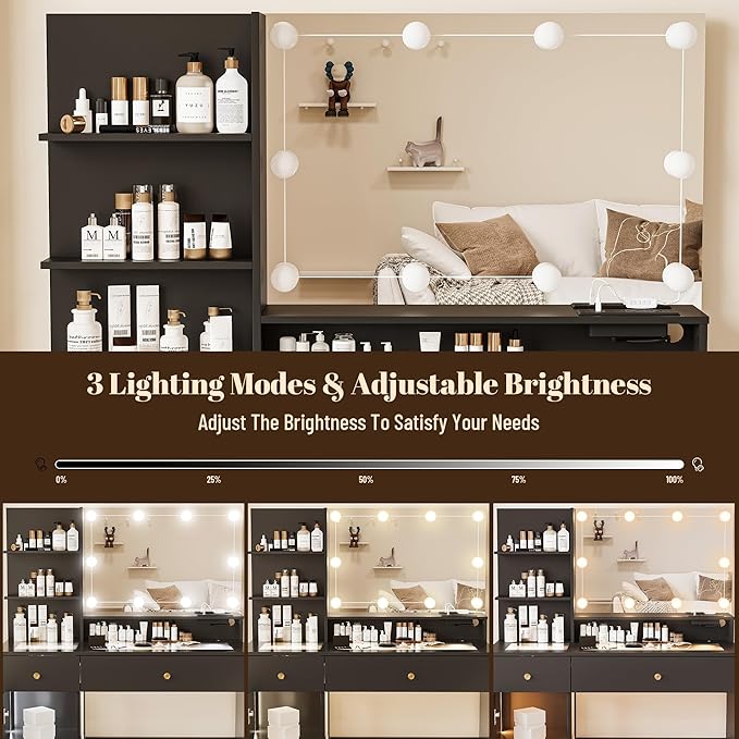 - 【Vanity Set with Large Mirror and LED Lights】This makeup vanity desk with lights features a large mirror with 10 Hollywood-style LED bulbs. Choose from 3 color modes (warm yellow, warm white, and cool white) and adjust the brightness settings to create the perfect lighting for your makeup needs. Ideal for home, work, hair salons, and studio makeup applications.