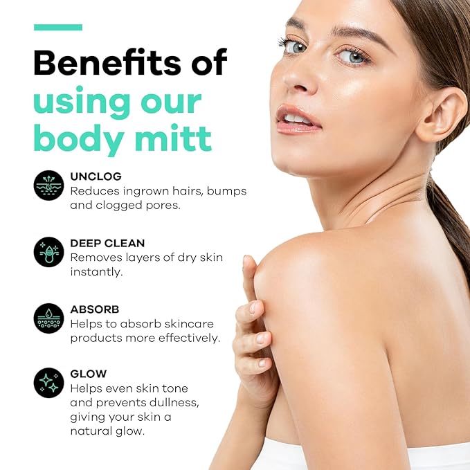 - BODY SCRUBBER FOR SMOOTHER TEXTURE & RENEWAL: This shower exfoliator mitt boosts circulation and supports natural skin renewal. Use weekly to maintain silky, even skin tone and to reduce the appearance of clogged pores or ingrown hairs.